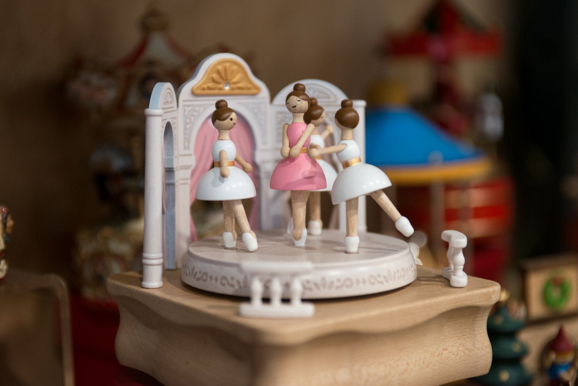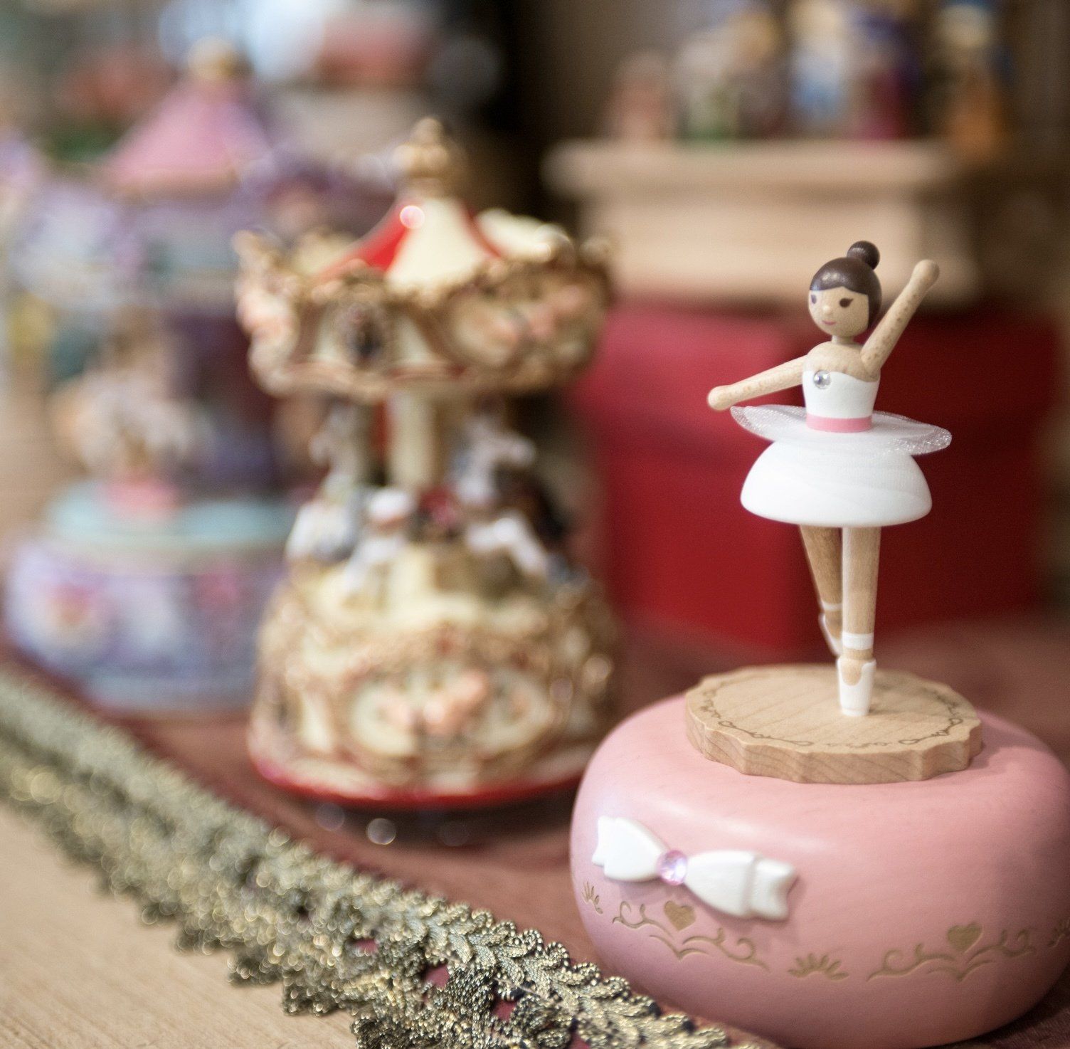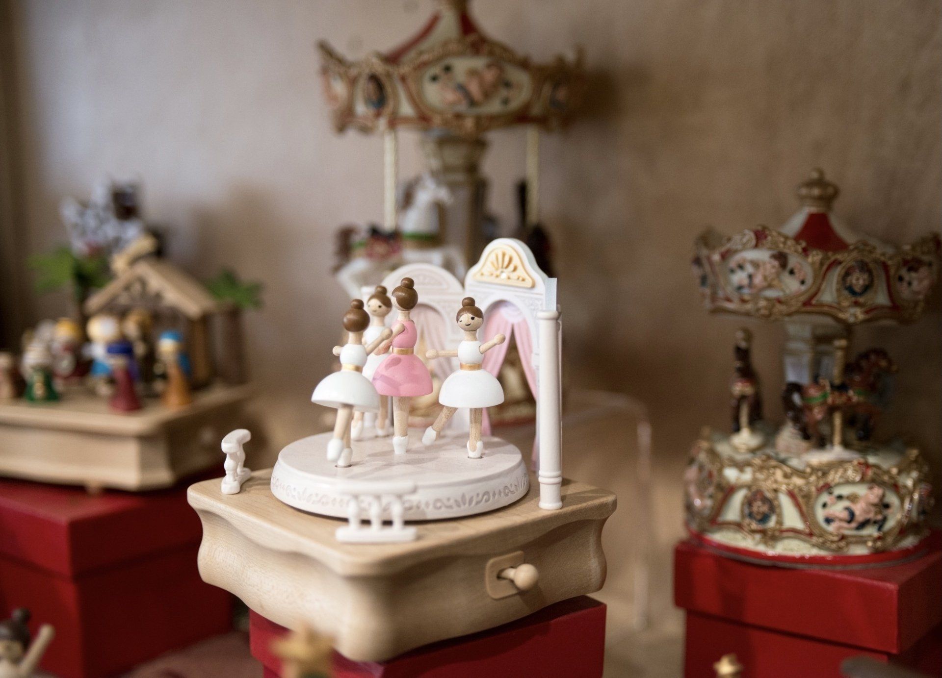 Il negozio offre un vastissimo assortimento di giostrine musicali e carillon che spazia da quelli in legno anni '50 di ispirazione retrò alle magiche Boule de Neige (le bolle di vetro), dalle intramontabili giostre di cavalli ai carillon di Natale e a quelli in ceramica perfetti per un regalo da battesimo.