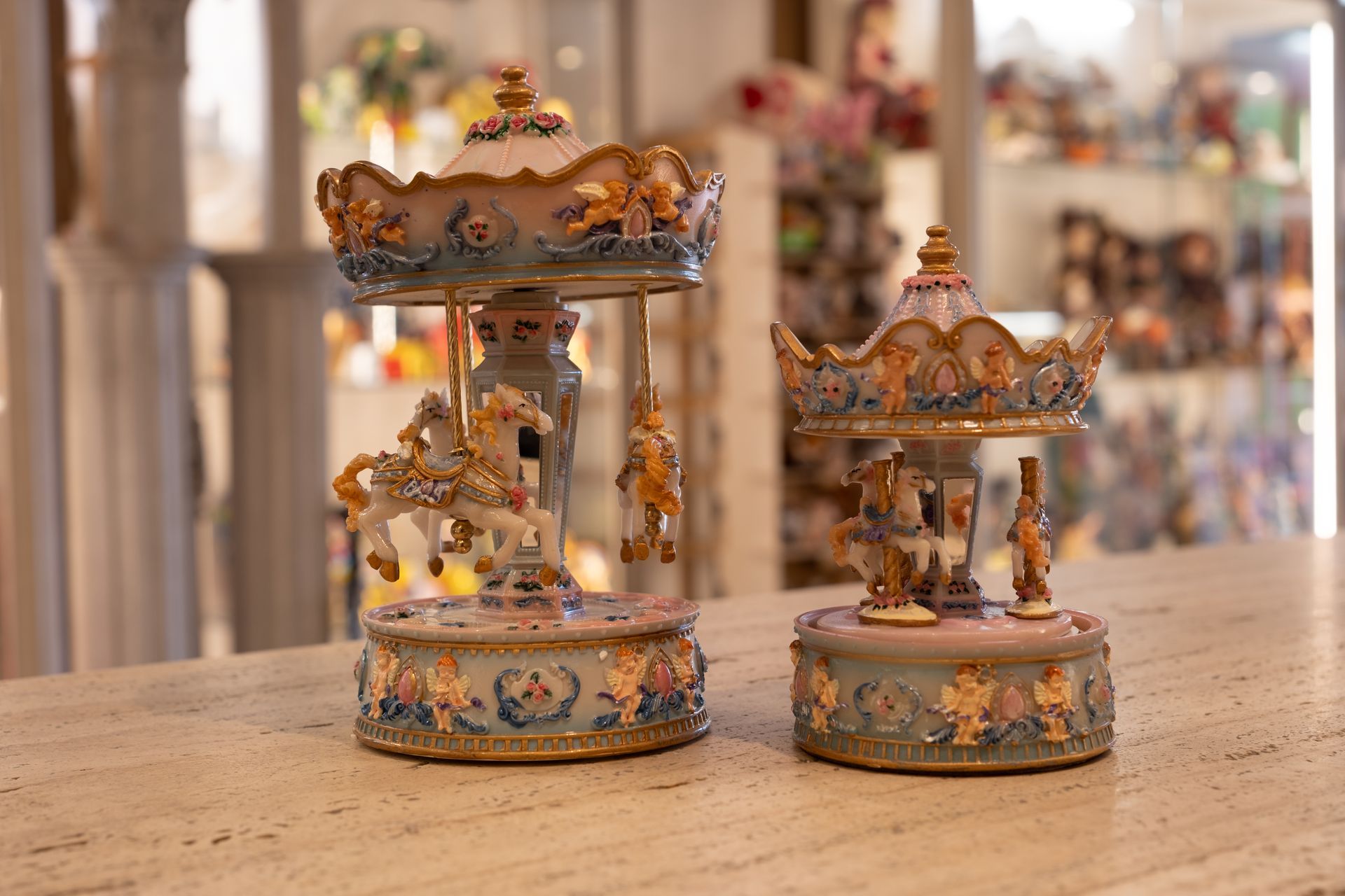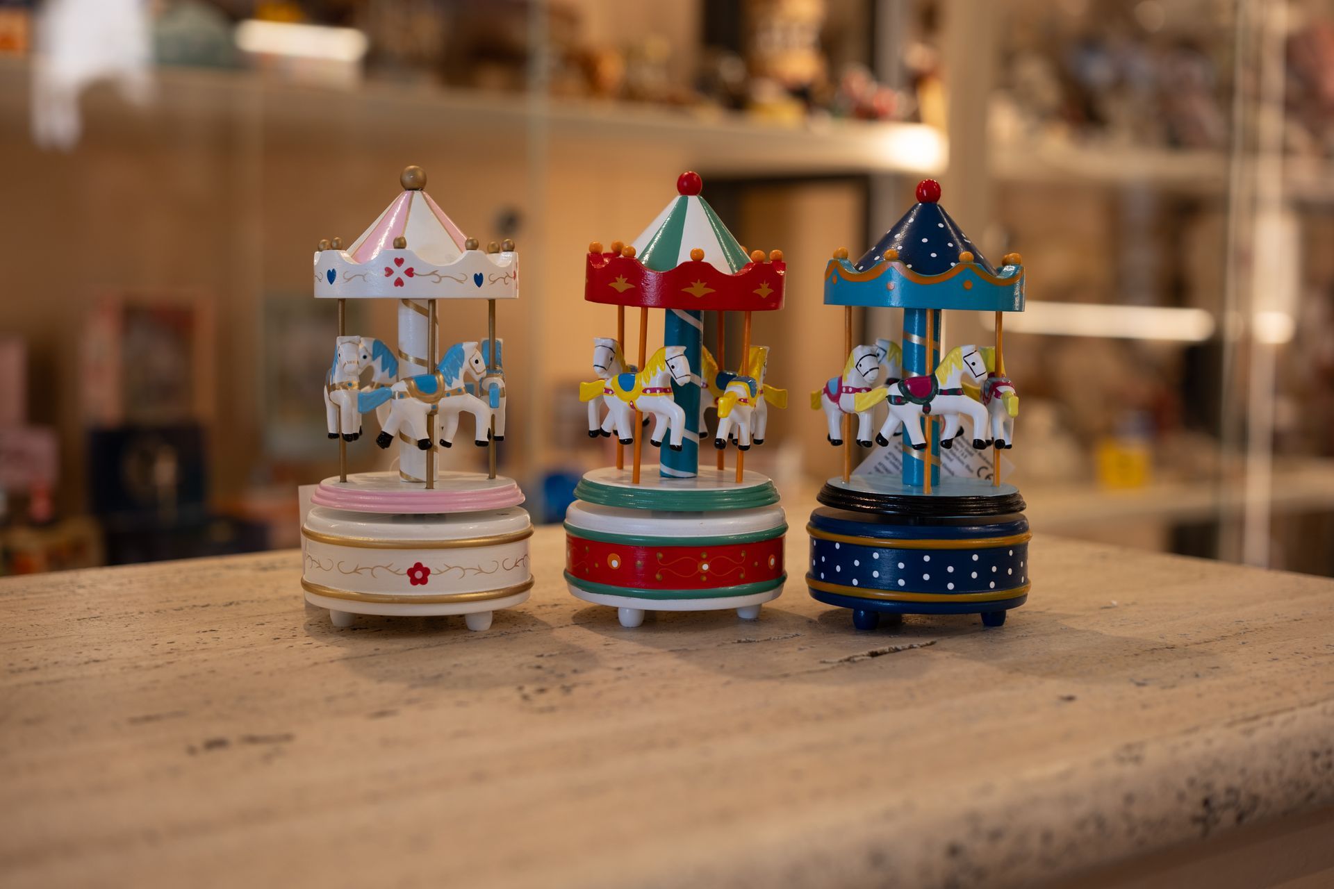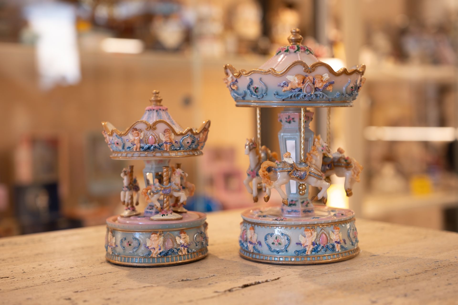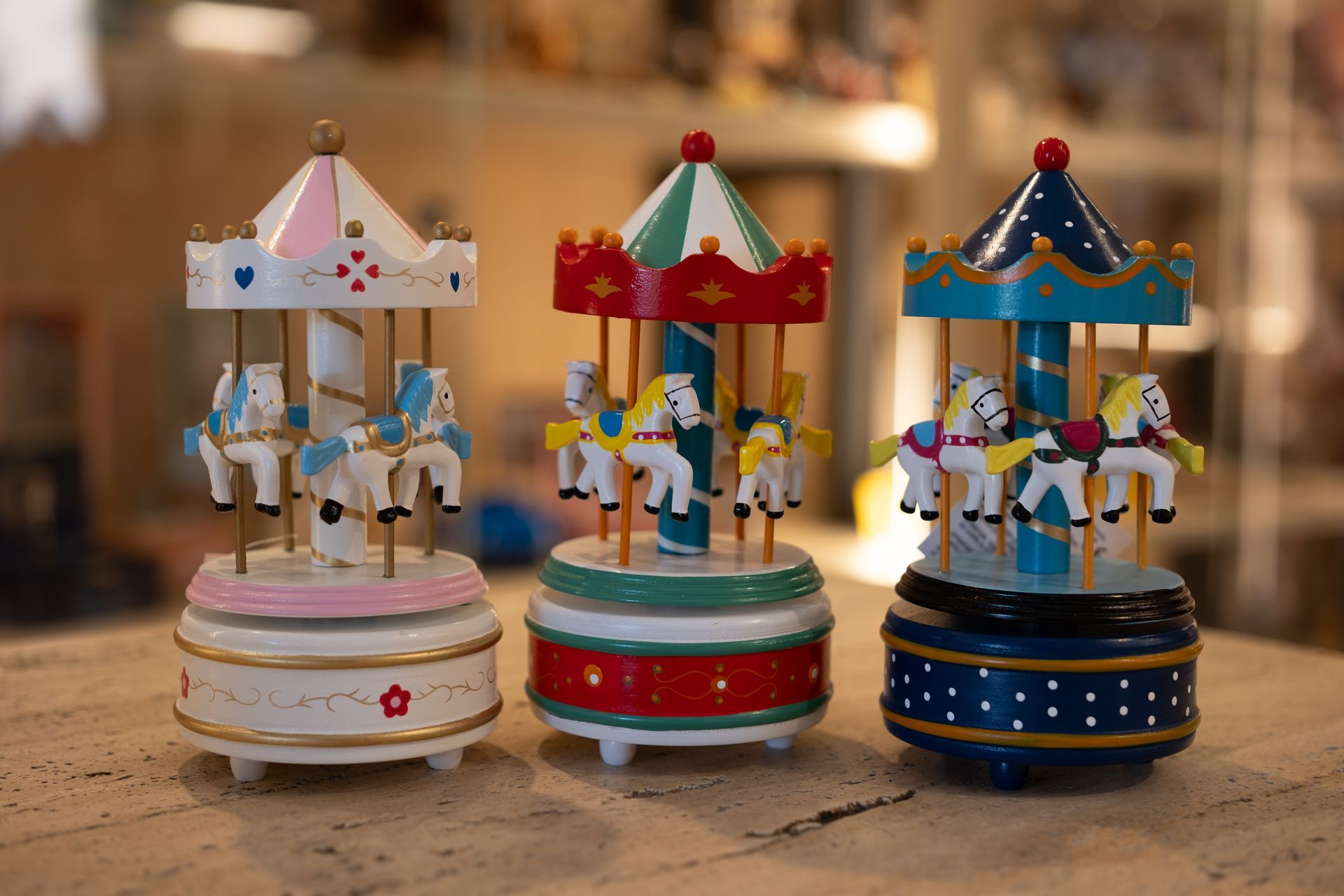 The store offers a huge assortment of musical carousels and music boxes ranging from retro-inspired 1950s wooden ones to magical Boule de Neige (glass bubbles), from timeless horse carousels to Christmas music boxes and ceramic ones perfect for a christening gift.