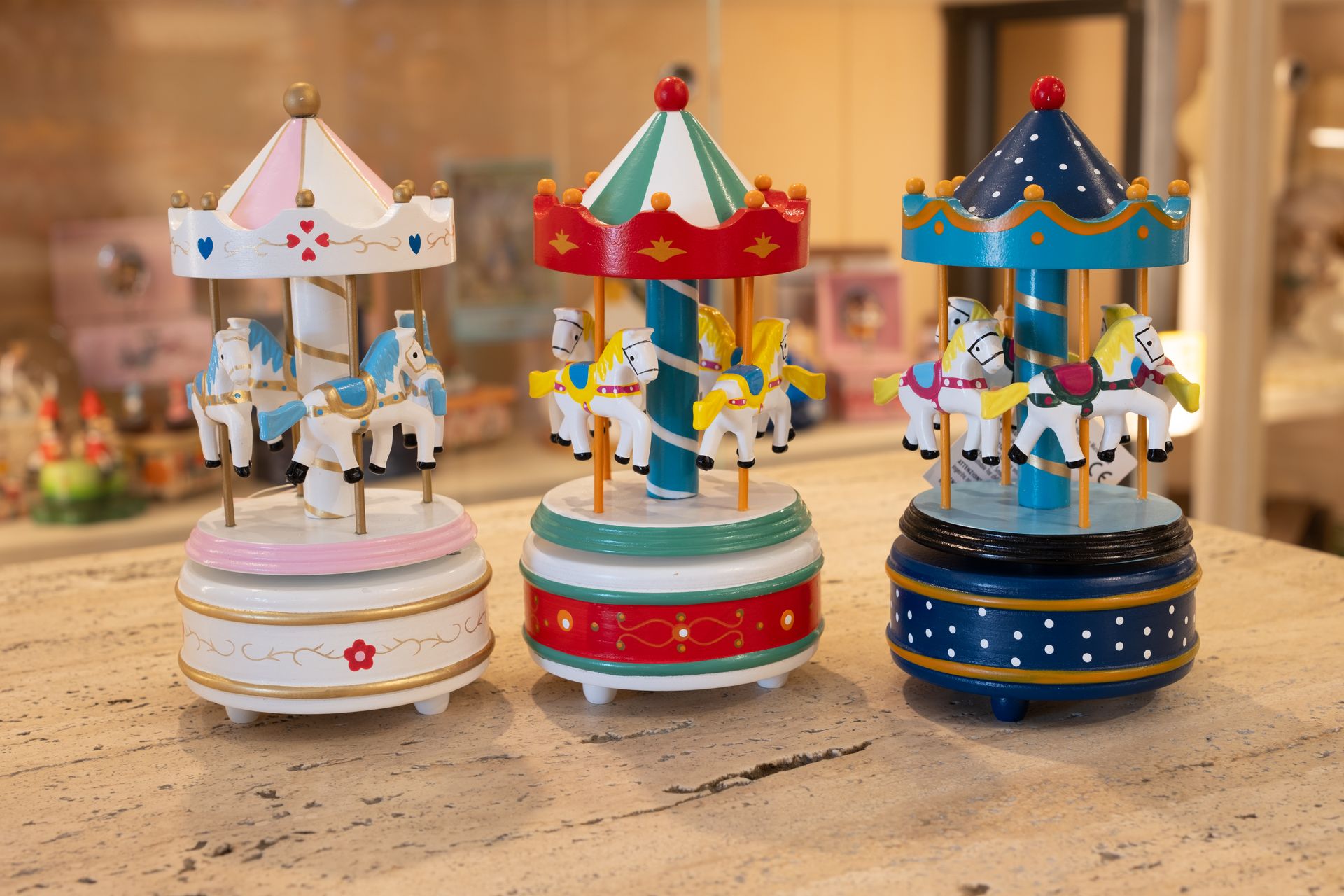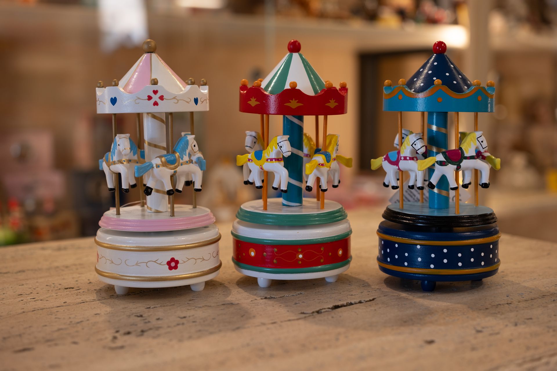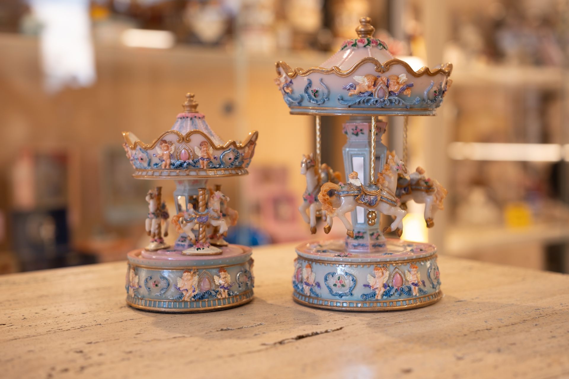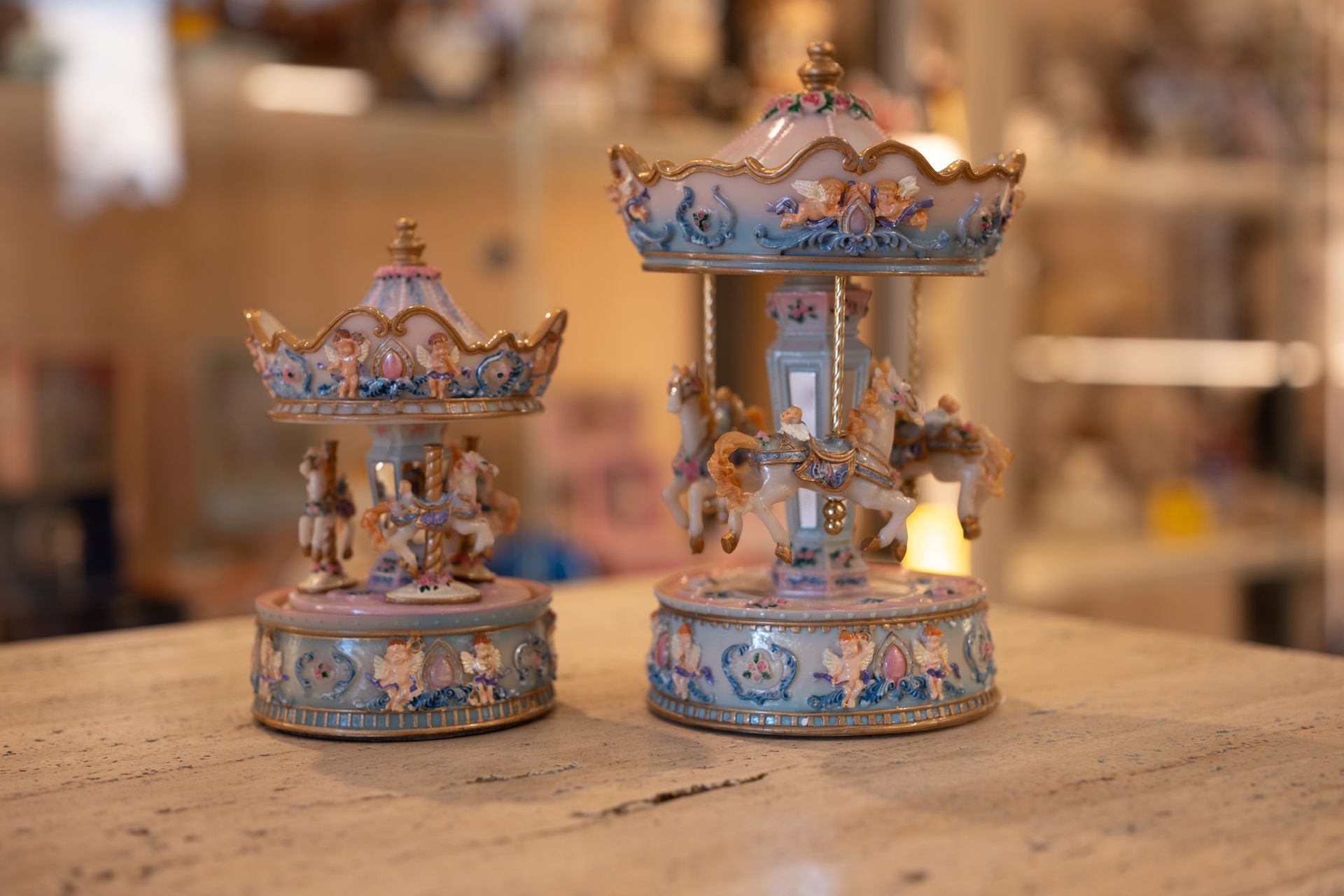 The store offers a huge assortment of musical carousels and music boxes ranging from retro-inspired 1950s wooden ones to magical Boule de Neige (glass bubbles), from timeless horse carousels to Christmas music boxes and ceramic ones perfect for a christening gift.